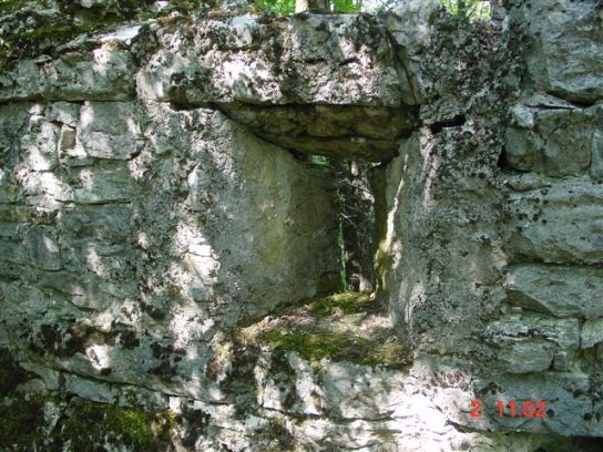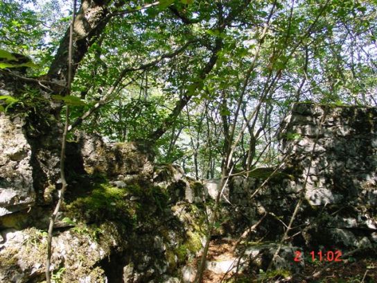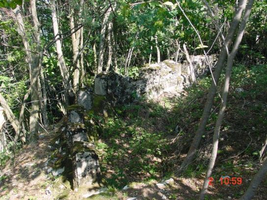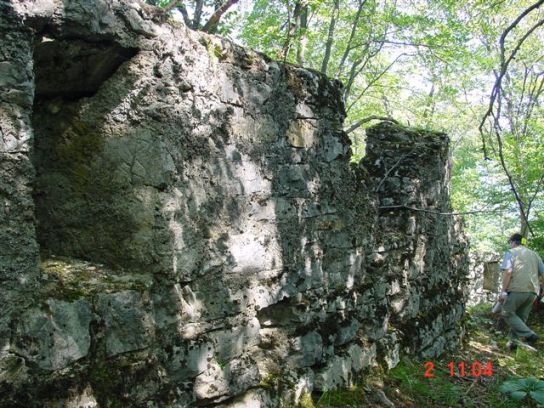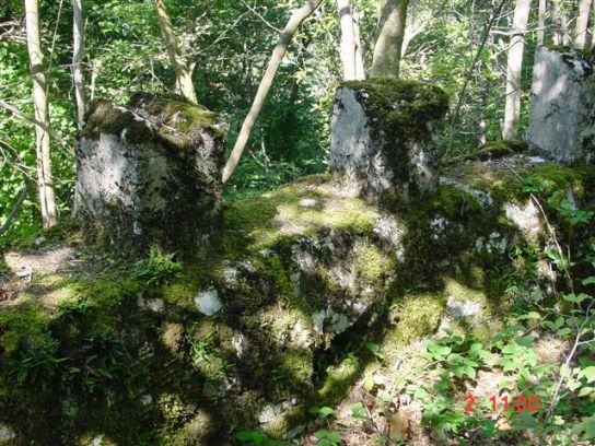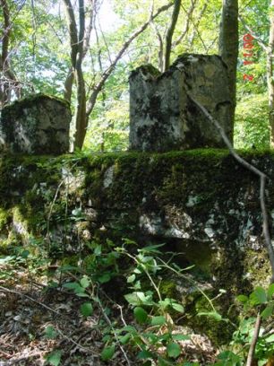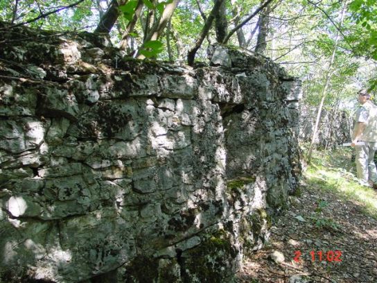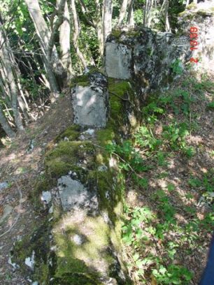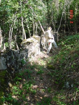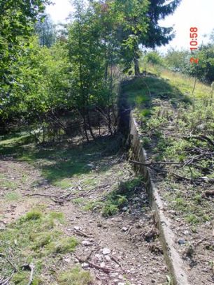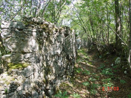 Kurz nach dem rechten Auslauf des Frontgrabens beginnt die lange Schutzmauer. Sie endet oberhalb der Werkstraße in Richtung der Kaserne. Bei dieser befindet sich der Gedenkstein der Landesschützen, die vermutlich die Kaserne und die Werksstraße gebaut haben. |