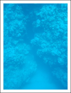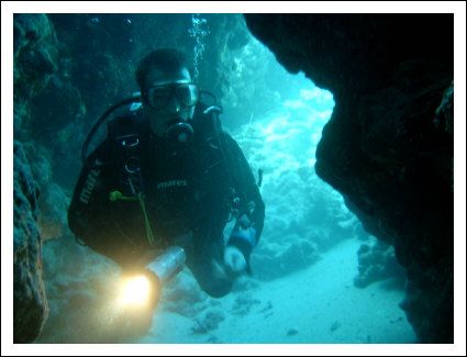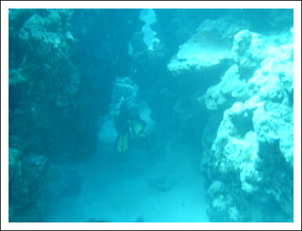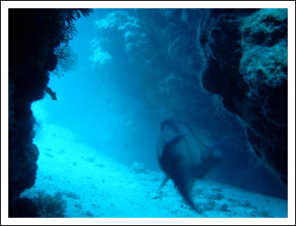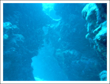 einige Fische tummeln sich im Canyon. In den kleinen Höhlen rechts und