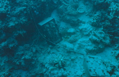 Der Bootsrumpf liegt zerstört an der Riffkante.