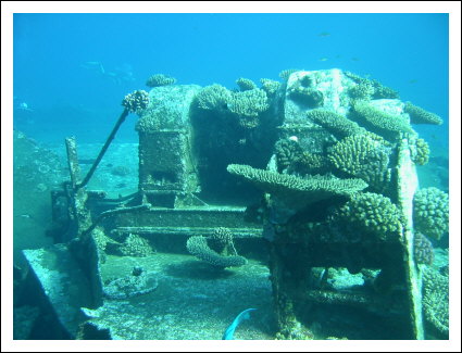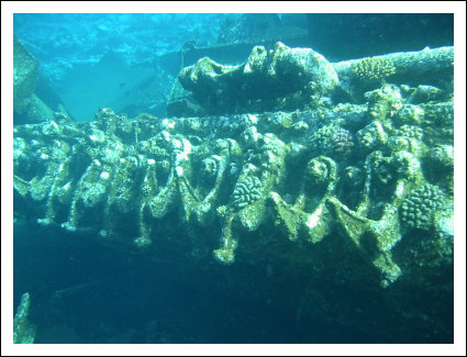 Mares-Automat etwas fester eingestellt. 26.12.01, vierter Tag auf der Angelina. Stefan und Andre hatten sich wieder erholt und sind für Tauchgänge bereit. Die Video-Kamera ist für die Tauchgänge vorbereitet und wartet auf den Einsatz. Unsere Wahl fiel auf Tiran mit der guten Aussicht auf einen Tauchgang zum Wrack der Kormoran. Als erster Tauchgang stand selbstverständlich das Thomas Riff mit dem Canyon auf dem Programm. Wir wurden genau über dem Anfang vom Canyon von Mohamed, unseren, Kapitän der Angelina, abgesetzt. Zügig begann das Abtauchen zum Canyon. Die Drift trug uns um das Riff herum. Das Einsteigen bereitete dank kleiner Wellen keine Probleme. Wir fuhren weiter zum Jackson Riff. Dort wollten wir unsere Mittagspause absitzen. Jetzt befanden sich schon deutlich mehr Boote an den Leinen. Wir machten uns für unserem zweiten Tauchgang fertig. Stefan hat wider seine neue Videokamera dabei. Wir tauchen zur roten Anemone ab, an der großen Gorgonie vorbei, zur Strömungskante. Im Flachwasser hatten wir nur eine leicht Drift über die Riffkante. So konnten wir uns wunderbar im Korallengarten bewegen und langsam zur Angelina zurücktauchen. Unser Kapitän erklärte uns, dass einer Fahrt zur Kormoran nichts mehr im Wege stehe. Die Wellen, der Wind und die Drift sind für den Tauchgang optimal. Wir machten die Leine los und fuhren Richtung Leuchtturm in deren Nähe das Wrack liegt. Ein Teil des Wracks ragt aus dem Wasser, was ein einfaches Ansteuern erleichterte. Der Ausstieg ging wie immer geordnet über die Bühne und auch der Automat machte keine Probleme mehr. Es ist ein reiner Flachwassertauchgang, mit einer maximalen Tiefe von 8m, in einer sonnendurchfluteten Zone. Der Maschinenraum mit dem mächtigen Diesel liegt offen. Es lohnt sich in die Hohlräume des Wracks zu schauen, sehr viele Fische finden hier Unterschlupf. Die Winsch und die Poller sind schön zu erkennen. Die Vielfalt der Korallen erstaunt und auch die Anzahl der intakten Tischkorallen ist enorm. Auf diesen Tauchgang haben wir lange gewartet und er hat uns nicht enttäuscht