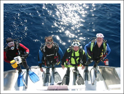 Der Vorteil unserer Exklusivbelegung auf dem Tauchboot Angelina stellte sich sofort bei der Planung des ersten Tauchtages heraus. Wir konnten die Zielgebiete und die Reihenfolge der Tauchgebiete selbst bestimmen. Für den ersten Tag mit dem Boot am, 23.12.01, stand Tiran, mit dem Thomas Riff als ersten Tauchgang auf unserer Wunschliste. Um 8.00 Uhr trafen wir uns an der Tauchbasis und wurden mit dem basiseigenen Minibus zur Jetty gefahren. Die liegt direkt vor dem Iberhotel Lido, das von der Landseite wie ein Schiff gestaltet ist. Die Körbe mit dem Gerödel waren schon von den Heinzelmännchen des Sinai Dive Club an Bord verstaut. Uns blieb so nur noch die Wahl zwischen normaler Luft oder Nitrox mit 32% oder 38% Sauerstoff. Wir wurden von unserem Kapitän Mohamed, der schon ewig auf der Angelina vom Dive Club fährt, präzise über dem Canyon des Riffs ausgeladen. Unser Tauchguide Patrick checkte die Drift und wir begannen den Tauchgang. Leider war die Sicht nicht so optimal. Den Canyon sahen wir nicht schon von der Oberfläche aus, sondern er erschien zuerst schemenhaft, dann klarer aus dem Blau des Meeres. Wir hatten nur leichte Drift, so blieb uns genügend Zeit um den Canyon mit seinen Bögen genau zu betrachten. Uli-Flo der mit dem Hub-Jacket tauchte signalisierte uns plötzlich ein Problem mit der zweiten Stufe (Proton). Es stellte sich heraus, dass eine Plastikklappe, an der Unterseite der zweiten Stufe, sich etwas gedreht hatte und die zweite Stufe langsam mit Wasser füllte. Auf der maximalen Tiefe erkannten wir dann den Zusammenhang mit der Klappe und dem Wasserstand im Proton. Darauf hin konnten wir ihn wieder in seinen Sollzustand bringen. Die Drift brachte uns bequem um´s Riff wo uns schon ein Weißspitzenriffhai überraschte. Das Reinklettern wurde durch die stärkeren Wellen erschwert, aber mit den stabilen Flossenleitern war es einfach die Tauchplattform zu erklimmen. Von der Besatzung der Angelina wurden wir schon mit einem Tee erwartet.