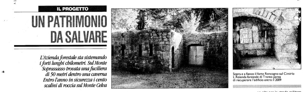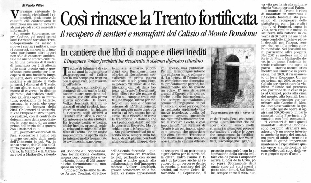 L´articolo uscito sul "Trentino", Domenica 19.02.2006, scritto da Paolo Piffer, che riguarda la Fortezza di Trento. Saluti, VJ Wurde am Sonntag auf einer Seite der Zeitung "Il Trentino" veröffentlicht. Arturo Condini, Chef der hiesigen kommunalen Forstverwaltung, und meine Wenigkeit wurden vom Giornalisten Paolo Piffer interviewt. Herr Piffer arbeitet auch für die Gemeinde und Stadt Trient. Für das Programm der Instandsetzung von Teilen der alten Befestigungen und von Teilen der feldmäßigen Befestigungen wurden 300000 Euro von der Provinz und der Kommunalverwaltung der Forstverwaltung zur Verfügung gestellt. Diese Mittel werden für verschiedene Projekte verwendet: Instandsetzung der oberen Batterie Mattarello Instandsetzung der Batterie Roncogno Instandsetzung der Kavernenbatterie "100 Stufen ", diese Batterie ist Teil der feldmäßigen Anlagen des Monte Celva, bestehend aus 5 Kavernenbatterien,2 Positionsbatterien in Beton und einer PzH-Batterie. Instandsetzung der Infanterieanlage auf dem Soprasasso Instandsetzung der Kavernenbatterie Pontesel auf dem Soprasasso (ex Batterie Soprasasso Nord). Instandsetzung der original Armierungsstraße von Vazon auf den Gipfel des Palon (Monte Bondone). Instandsetzung der Armierungsstraße auf den Artilleriestützpunkt Casteller della Grua und teilweise Instandsetzung dieses großen Stützpunktes mit seinen umfangreichen feldmäßigen Befestigungen. Instandsetzung der Armierungsstraßen auf dem Monte Calisio Instandsetzung von Zisternenanlagen und Teilen der alten Wasserleitungen auf dem Soprasasso. Das Programm dauert bis 2009 und ist im Etat offiziell abgesegnet. Im Trentin beginnt man sich seiner Geschichte zu erinnern und das Interesse der Bevölkerung ist vorhanden. Ein kleiner Schritt weiter, um die Festung des GM Steinhart wieder ans Licht zu bringen. Die Internetseiten vom Uli werden ausdrücklich erwähnt im Artikel. Gruss VJ